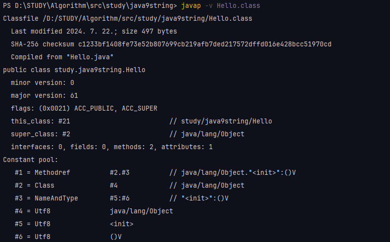예를 들어, #21 Class 엔트리는 #22를 참조합니다. #22 엔트리는 “Hello”로 검사 중인 클래스 이름을 나타냅니다. 클래스 이름 앞에 슬래시로 구분된 패키지 경로 study/java9string 가 같이 붙습니다.