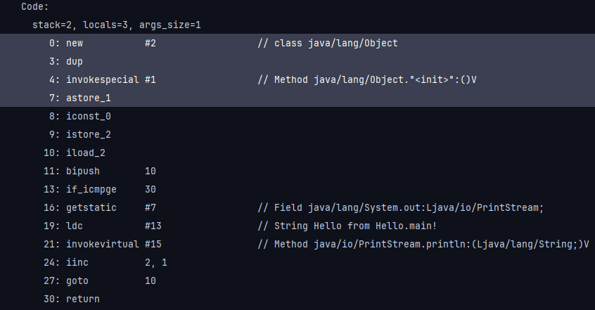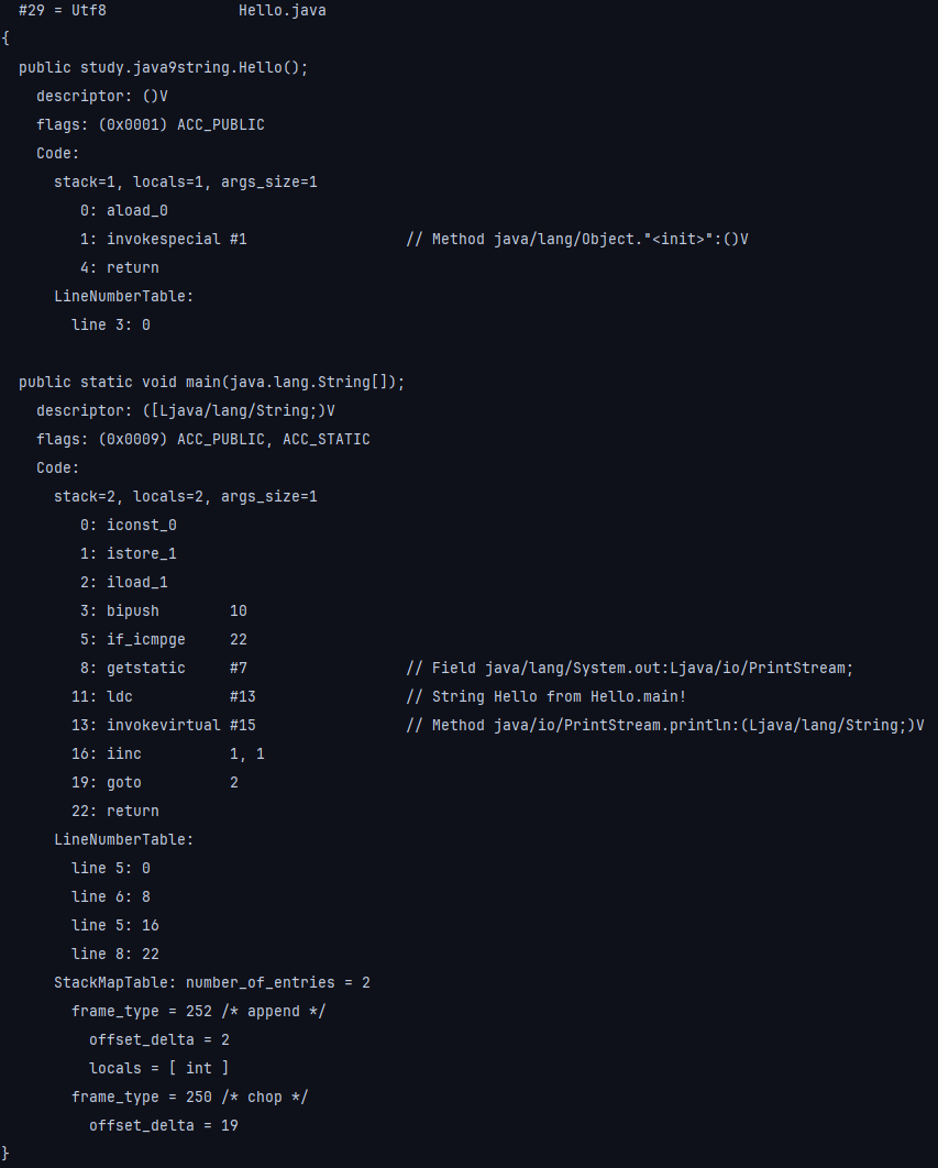 그 뒤에는 상수 풀에 등록된 심볼로 구성된 Hello 클래스와 main 메소드에 대한 기계어가 사람이 읽을 수 읽는 형태로 나와 있는 것을 확인할 수 있습니다. #번호 형태로 상수 풀 엔트리를 참조하는 것을 확인할 수 있습니다.
