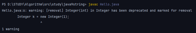 Integer k = new Integer(1); 코드를 추가 한 후 컴파일하면 deprecated 되었다고 뜨는 것을 발견했습니다. 그 이유는 기존 new 생성 방식보다 valueOf() 메소드의 사용으로 이미 생성된 Integer 객체를 캐싱하여 객체 생성 비용을 줄이고 메모리 사용을 최적화할 수 있기 때문에 new를 사용하는 방식은 권장되지 않습니다.